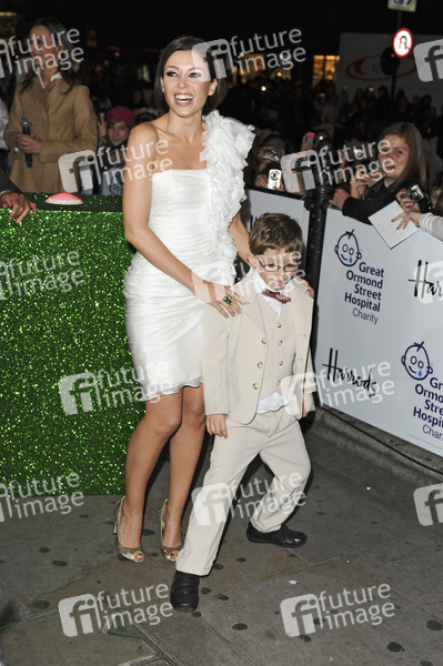 Dannii Minogue und der Great Ormond Street Hospital Patient Dominic schalten die Weihnachtsbeleuchtung des Kaufhauses Harrods in London an