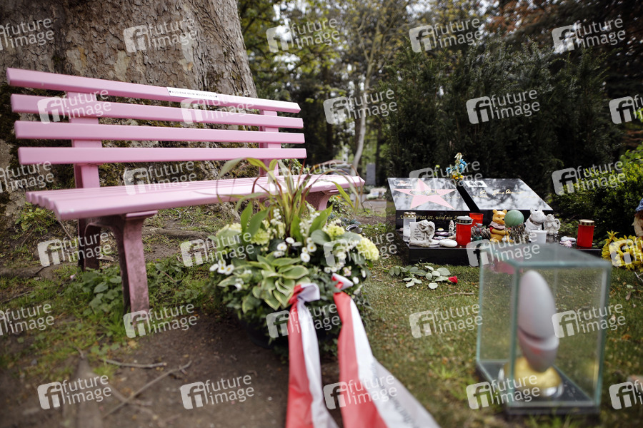 Das Grab von Dirk Bach auf dem Melaten-Friedhof. Der Entertainer war 2012 unerwartet in Folge von Herzproblemen mit 51 Jahren gestorben. An Dirk Bachs Grab brachte seine langjährige Kollegin und Freundin Sonja Zietlow den Deutschen Comedypreis an. Immer wieder bringen Freunde und Fans kleine Figürchen vorbei oder haben auf der rosa Bank am Grab 'Eine Audienz beim Mausekönig'. Köln, 06.05.2021