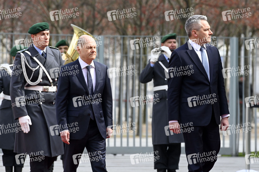 Olaf Scholz und Karl Nehammer beim Empfang des Bundeskanzlers der Republik Österreich mit militärischen Ehren im Bundeskanzleramt. Berlin, 31.03.2022
