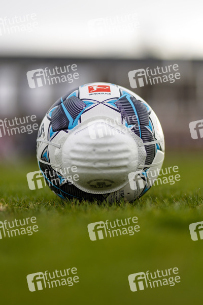 Ein Fußball mit Atemschutzmaske