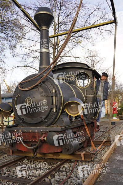 Ein weiteres Filmrequisit für die 'Giant Props' Sammlung ungewöhnlicher Originale, die Lokomotive Emma aus den Jim Knopf Filmen, wird auf der Straße der Giganten im Filmpark Babelsberg aufgestellt. Filmparkchef und 'Lokomotivführer' Friedhelm Schatz organisiert den Transport. Potsdam, 16.11.2020