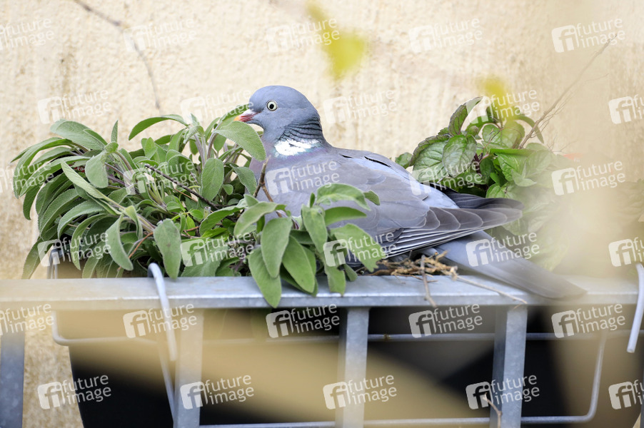 Ringeltaube brütet auf einem Berliner Balkon. Berlin, 16.04.2021