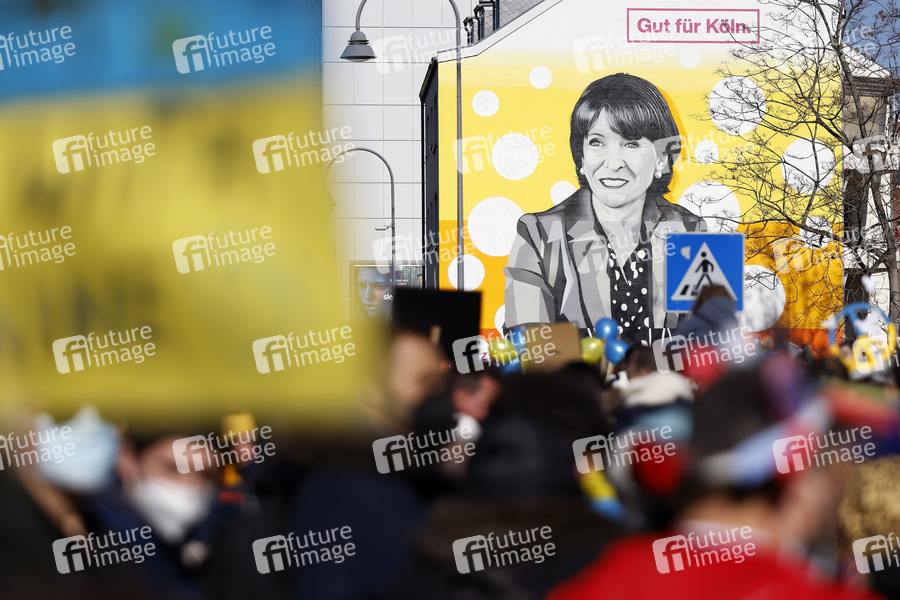 Henriette Reker ließ in der Severinstraße anlässlich ihrer anstehenden Wiederwahl ein großes Wandbild mit ihrem Konterfei anfertigen. Das Werk des Kölner Künstlerkollektiv 'Coloured Boulevard' erinnert in seinem Stil an Diktatoren-Bildnisse, wie man sie aus Nordkorea kennt - hier zu sehen am Rosenmontag 2022. Köln, 28.02.2022
