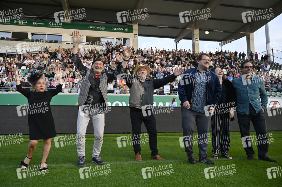 ChrisTine Urspruch, Claus Dieter Clausnitzer, Axel Prahl, Björn Meyer, Mechthild Großmann und Jan Josef Liefers bei der Premiere des ARD-Krimis 'Tatort - Ein Freund, ein guter Freund' zum 20 jährigen Jubiläum des Münsteraner Tatorts im Preußenstadion. Münster, 30.08.2022