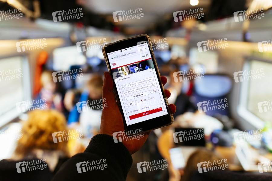 Reiseauskunft der Deutschen Bahn unter bahn.de aufgenommen in einem ICE. Köln, 13.03.2019