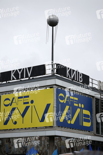 Unter dem Titel 'Wir werden nie vergessen' demonstrierten tausende Menschen für den Abzug russischer Truppen aus der Ukraine, beginnend vom Cafe Moskau in der Karl-Marx-Allee zur russischen Botschaft an der Straße Unter den Linden und weiter zum Brandenburger Tor. Das Cafe Moskau wurde aus Anlass des Jahrestages der Invasion vorübergehend in Cafe Kiew umbenannt. Berlin, 24.02.2023