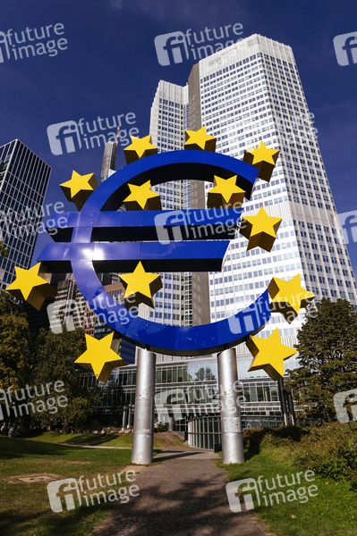 Die Euro-Skulptur ist ein Kunstwerk von Ottmar Hörl und steht vor dem Eurotower im Bankenviertel. Frankfurt, 31.08.2020