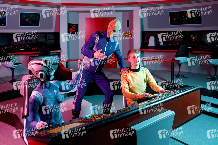 GEEK ART - Bodypainting meets SciFi, Fantasy and more: 'Star Trek Discovery' Photoshooting mit Model Barbara Wegener als Airiam und Enrico Lein als Saru auf der Brücke vom Raumschiff Enterprise im Filmwelt Center. Bad Münder, 18.04.2019 - Ein Projekt des Fotografen Tschiponnique Skupin und des Bodypainters und Transformakers Enrico Lein