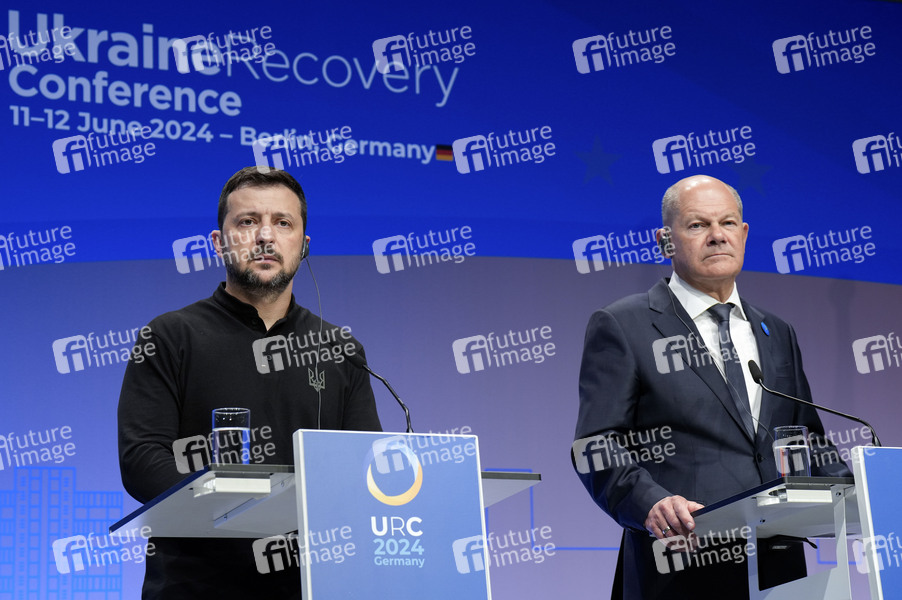 Wolodymyr Selenskyj und Olaf Scholz bei der Pressekonferenz zur Ukraine Recovery Conference 2024 unter dem Motto 'United in Defense. United in Recovery. Stronger together.', auf dem Messegelände. Berlin, 11.06.2024