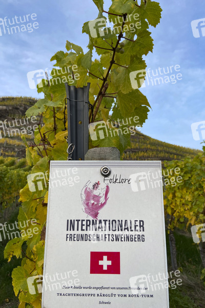 Internationaler Freundschaftsweinberg der Schweizer Trachtengruppe Bärglüt vom Rotä-Turm in der Herbststimmung in den Mosel-Weinbergen. Winningen; 03.11.2020