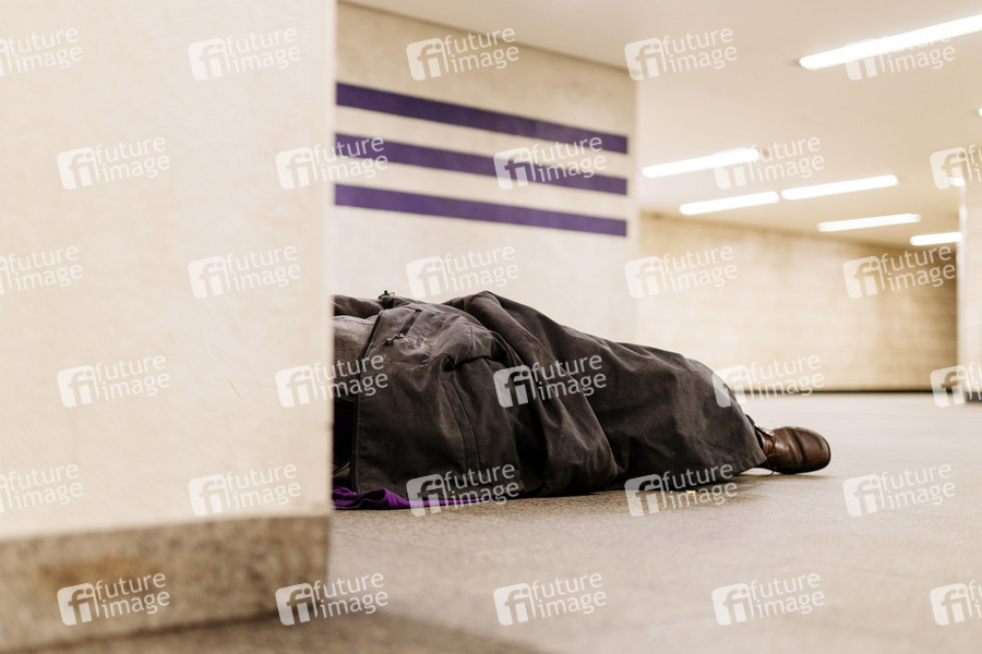 Ein Obdachloser schläft improvisiert einer Decke in einer U-Bahn-Haltestelle. Köln, 04.12.2019