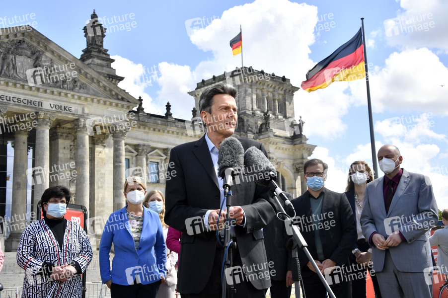 Rolf Mützenich und Fraktionsmitglieder bei einer Aktion über die Bilanz der Arbeit der SPD-Bundestagsfraktion vor dem Reichstagsgebäude. Berlin, 20.05.2021