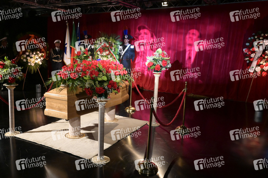 Der Sarg bei der Abschiednahme von Pippo Baudo im Teatro delle Vittorie. Rom, 18.08.2025
