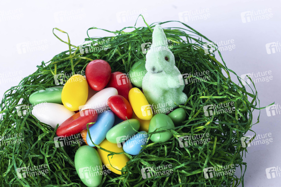 Osterhase aus Filz und Süßigkeiten in einem Osternest. (Symbolfoto, Themenfoto)