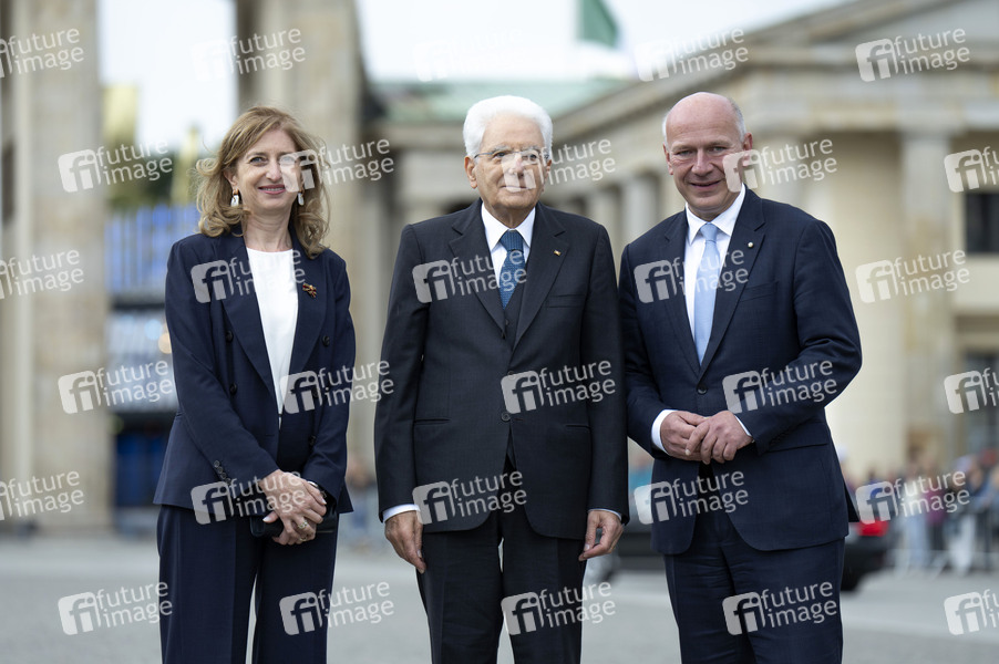 Laura Mattarella, Sergio Mattarella und Kai Wegner beim Empfang des Präsidenten der Italienischen Republik zum gemeinsamen Gang in Richtung Brandenburger Tor. Berlin, 27.09.2024