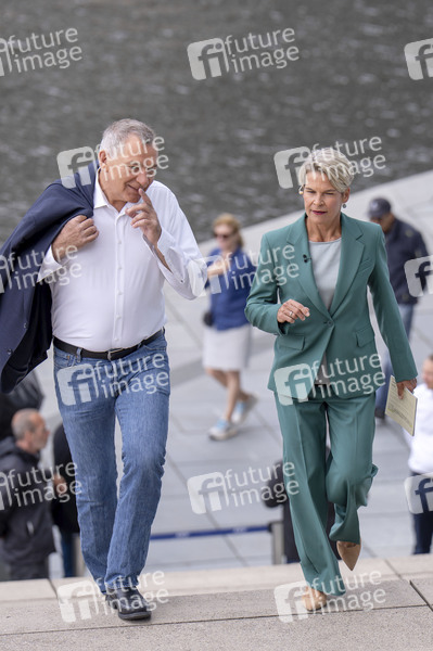 Jan van Aken und Anna Engelke beim ARD-Sommerinterview auf der Terrasse vom Marie-Elisabeth-Lüders-Haus. Berlin, 17.08.2025