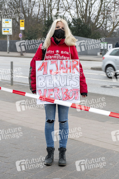 Melanie 'Melli' Wellendorf, Inhaberin Musik-Kneipe NahBar, bei der Protest-Veranstaltung Alarmstufe Rot - Alster in Flammen an den Messehallen am Heinrich-Hertz-Funkturm. Die Veranstalter wollen ein Zeichen setzen, dass mit vernünftigen Sicherheits- & Hygienemaßnahmen ( Testung, Anmeldung, App ) Öffnungen wie Gastronomie, Theater, Kinos, Fitnessstudios, entsprechende kulturelle Veranstaltungen etc. machbar sind. Hamburg, 20.03.2021