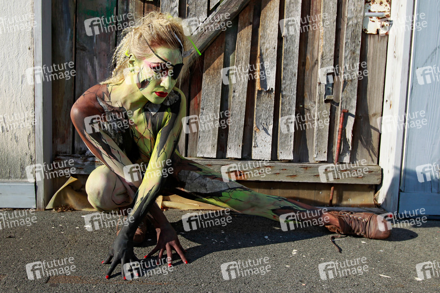 Bodypainting und Photoshooting mit Model Jutta auf einem Industriegelände in Hameln. Bodypaint-Künstler: Jörg Düsterwald, Make-Up und Hairstyling: Nadja Lück