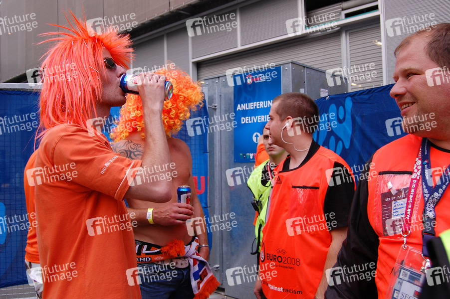 Fußball-Europameisterschaft 2008 / UEFA EURO 2008 in Österreich und der Schweiz. Italienische und Holländische EM Fans warten am Stade de Suisse in Bern auf ihre Teams zum Abschlußtraining, bevor das große Spiel Niederlande gegen Italien startet