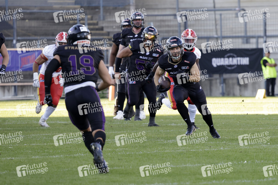 Justin Keaton (75), Nico Strahmann (19), Thang Le Minh (55) und Sandro Platzgummer (34) beim American Football-Spiel Frankfurt Galaxy gegen Madrid Bravos in der PSD Bank Arena Frankfurt. Frankfurt am Main, 10.08.2024