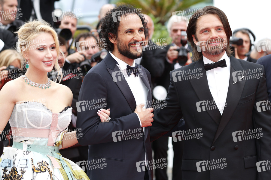 Maria Bakalova, Ali Abbasi und Sebastian Stan bei der Premiere des Kinofilms 'The Apprentice' auf dem Festival de Cannes 2024 / 77. Internationale Filmfestspiele von Cannes im Palais des Festivals. Cannes, 20.05.2024