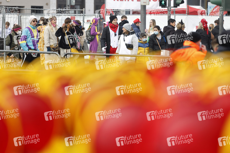 Jecken und Narren im Kostüm bei der Sessionseröffnung des Kölner Karneval am Elften Elften in der Kölner Innenstadt (Heumarkt). Der Kölner Karneval steht diesmal ganz im Zeichen von Corona, Teile der Altstadt dürfen nur nach der 2G-Regel betreten werden, das Kölner Dreigestirn ist nach einem positiven Test in Quarantäne. Köln, 11.11.2021