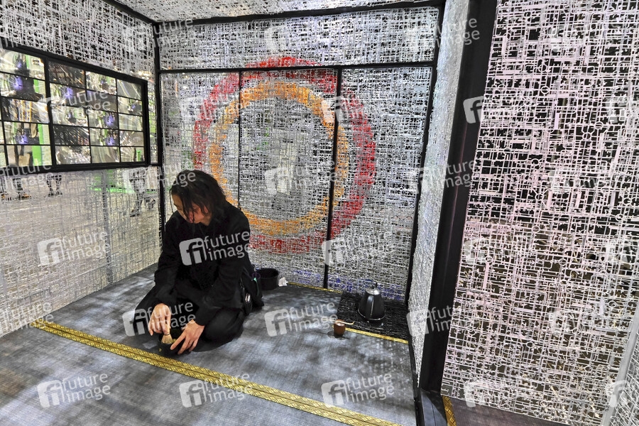 Medienkünstler Yoichi Ochiai serviert einen Tee in seinem gestalteten Teezeremonieraum 'Pla-an' aus Plastik-Spritzgussrahmen von Kunststoffmodellen während der Veranstaltung 'Gundam R Operation'. Der japanische Spielzeughersteller Bandai Spirits begann mit dem Versuch, Materialien aus Kunststoffverpackungen in Gundam-Kunststoffmodellen zu recyceln. Am 1. April 2021 startete das 'Gundam Recycling Project' mit dem Ziel, eine recyclingorientierte Gesellschaft zu bilden, indem die von Fans gesammelten 'Gundam'-Läufer (der Rahmen des Kunststoffmodells) recycelt werden. Die Menge der gesammelten Läufer wird voraussichtlich etwa 10 Tonnen pro Jahr betragen. Daher wurde das Projekt 'Gundam R Operation' mit dem Wunsch gestartet, mehr Menschen auf das 'Gundam Recycling Project' aufmerksam zu machen und das öffentliche Interesse am Recycling durch Gundam und Gunpla zu steigern. Tokio, 19.11.2021
