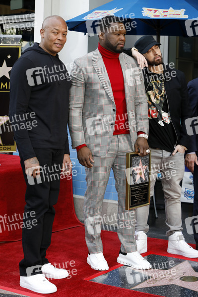Dr. Dre, Curtis '50 Cent' Jackson und Eminem bei der Zeremonie zur Verleihung von einem Stern an Curtis '50 Cent' Jackson auf dem Hollywood Walk of Fame. Los Angeles, 30.11.2020
