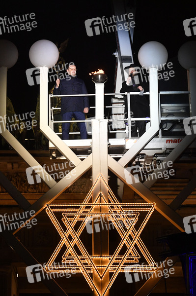 Jens Spahn und Rabbiner Yehuda Teichtal beim Zünden der ersten Kerze am Chanukka-Leuchter anlässlich der beginnenden Chanukka-Feiertage am Brandenburger Tor. Berlin, 10.12.2020
