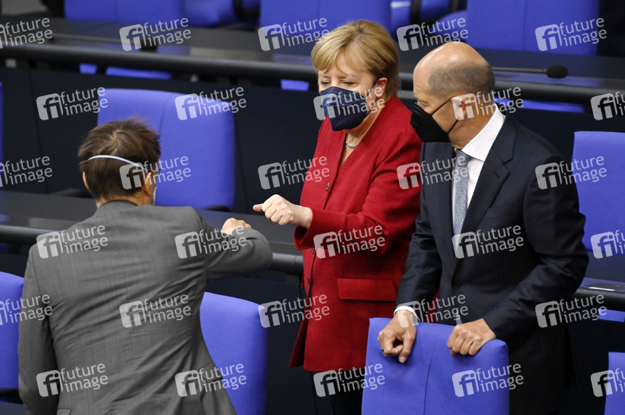 Karl Lauterbach, Angela Merkel und Olaf Scholz in der 238. Sitzung des Deutschen Bundestages im Reichstagsgebäude. Berlin, 25.08.2021