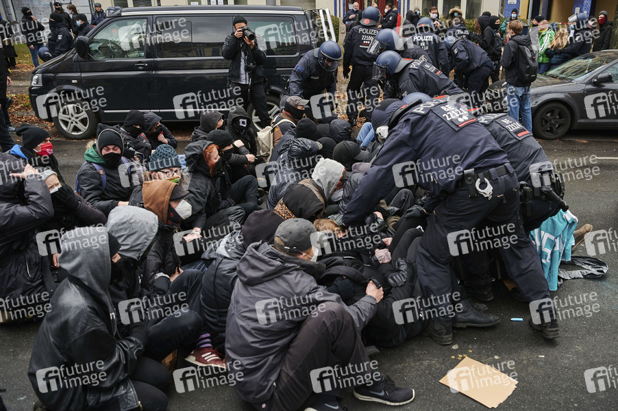 Linke Gruppen protestieren gegen eine Demonstration von Corona-Leugnern und Impfgegnern aus der Querdenken-Bewegung gegen die aktuellen Corona-Maßnahmen unter dem Motto 'Schweigemarsch gegen Diskriminierung und für Menschenrechte'. Der Demonstrationszug zieht durch den Berliner Stadtteil Prenzlauer zum Alexanderplatz. Berlin, 22.11.2020