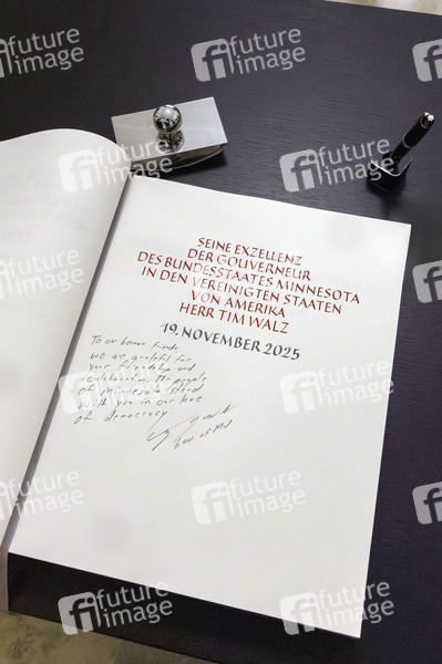 Gästebucheintrag von Tim Walz beim Empfang des Gouverneurs von Minnesota und früheren US-Vizepräsidentschaftskandidaten Tim Walz in der Staatskanzlei. Düsseldorf, 19.11.2025