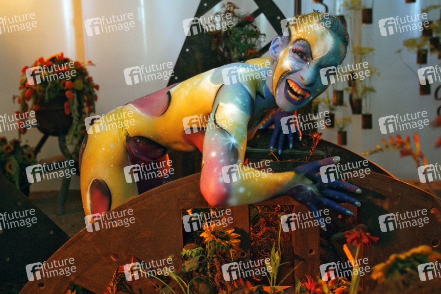 Bodypainting und Fotoshooting mit Model Sarah am Tag der offenen Tür der Meisterschule Justus-von-Liebig-Schule, Abteilung Floristik in Hannover-Ahlem. Künstler: Jörg Düsterwald