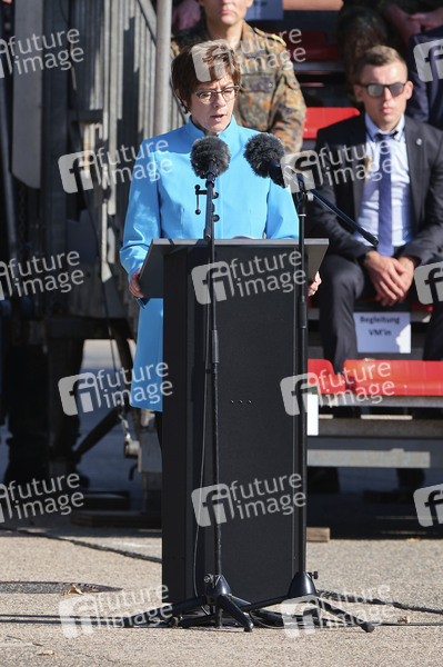 Verteidigungsministerin Annegret Kramp-Karrenbauer bei einem Appell für die Soldatinnen und Soldaten der Evakuierungsmission in Kabul und dem Feierlichen Gelöbnis von Rekruten des Fallschirmjägerregiments 31 in der Fallschirmjägerkaserne Seedorf. Seedorf, 22.09.2021