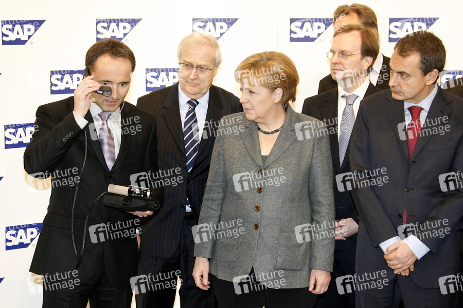 Eröffnungsrundgang von Bundeskanzlerin Merkel und Spaniens Ministerpräsident Zapatero auf der CeBIT 2010 (Centrum der Büro- und Informationstechnik), der weltgrößten Messe für Informations- und Computertechnik auf dem Messegelände in Hannover. Am Messestand von SAP.