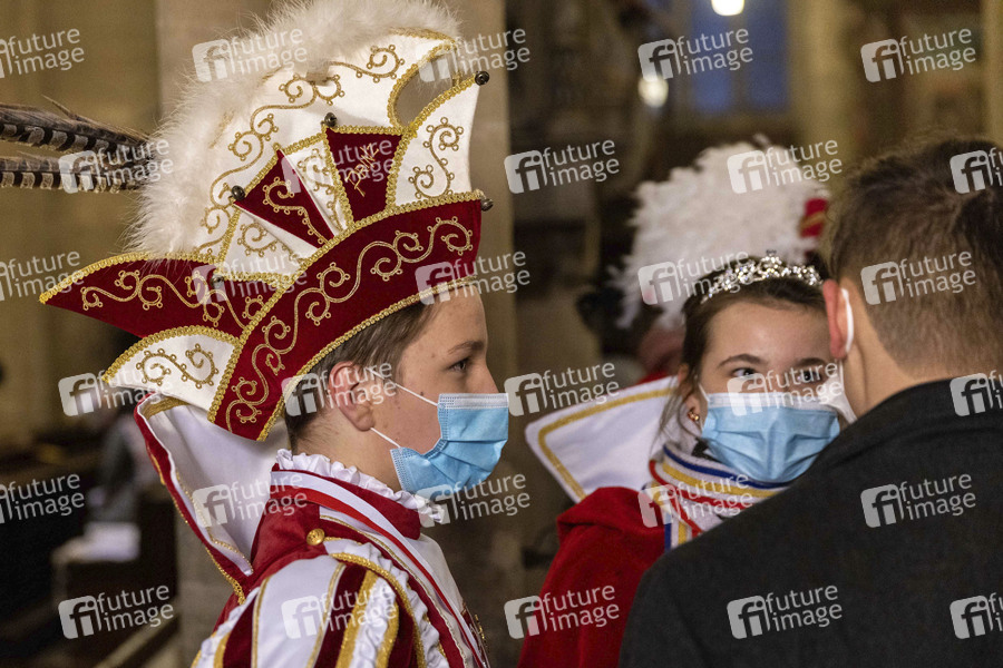 Der karnevalistische Gottesdienst fand unter 3G-Bestimmungen in der Severikirche auf dem Erfurter Domberg statt. Pfarrer Michael Neudert, gab den Karnevalisten, einschließlich den Prinzenpaaren Christian II. und Verena II. und den Kindern Luca I. und Noelanie I. den Segen für die anstehende Kampagne. (Personen im Bild: v.l. Kinderprinzenpaar Luca I. und Noelani I.). Erfurt, 16.01.2022