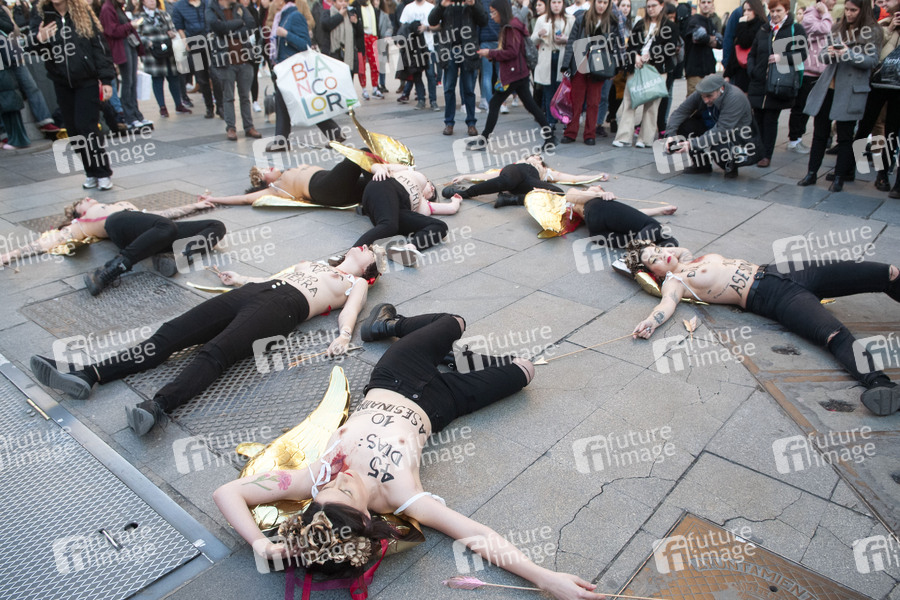 Femen Aktivistinnen bei einer Demonstration gegen Gewalt gegen Frauen am Valentinstag auf dem Plaza del Callao. Madrid, 14.02.2020