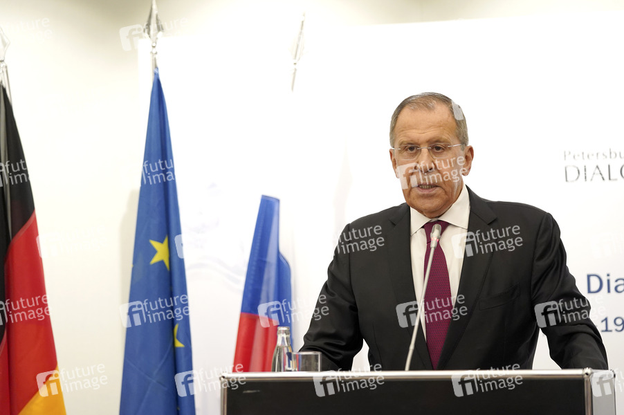 Sergei Wiktorowitsch Lawrow / Sergey Lavrov bei einer Pressekonferenz zur Eröffnung vom 18. Petersburger Dialog 2019 im Steigenberger Hotel. Königswinter, 18.07.2019