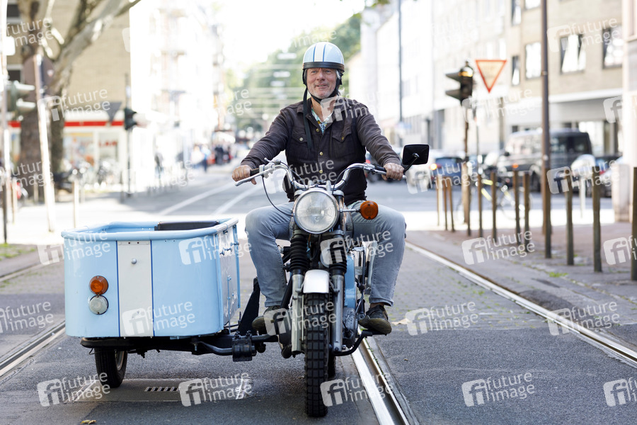Jürgen Becker in einem Motorrad mit Beiwagen beim Fotocall zum WDR-Film 'Besuch aus dem Westen - Jürgen Becker unterwegs im Osten Deutschlands' im Mauritiussteinweg. Köln, 22.08.2019