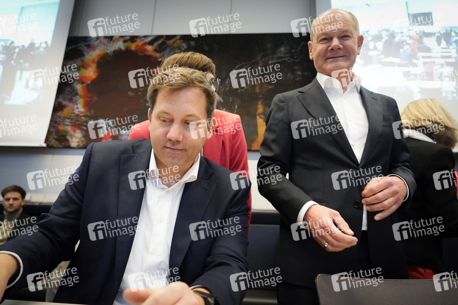 Lars Klingbeil und Olaf Scholz bei der Fraktionssitzung der SPD-Bundestagsfraktion im Reichstagsgebäude. Berlin, 28.01.2025
