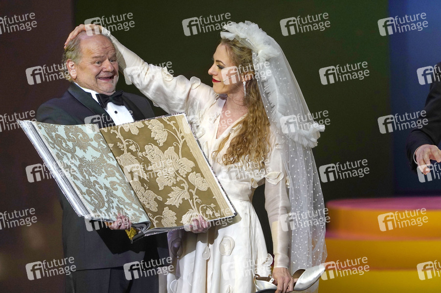 Gottfried Breitfuss und Paulina Plucinski bei der Fotoprobe der Oper 'Pferd frisst Hut' unter der Regie von Herbert Fritsch in der Komischen Oper Berlin im Schillertheater. Berlin, 05.02.2025