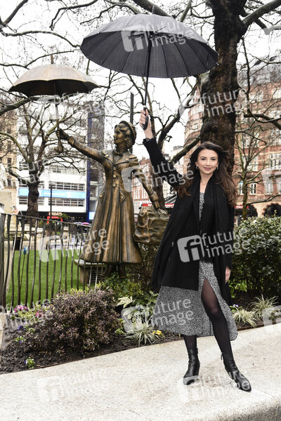 Zizi Strallen mit Mary Poppins Statue beim Launch des 'Scenes in the Square' Statuen-Weges mit acht ikonischen Filmszenen von 1920-2020 am Leicester Square. London, 27.02.2020