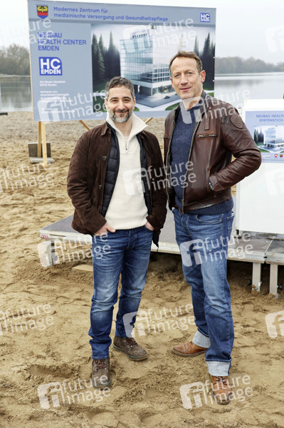 Denis Moschitto und Wotan Wilke Möhring beim Fototermin am Set der Doppelfolge des ARD-Krimis 'Tatort - Ein guter Tag / Schwarzer Schnee' am Eichbaumsee in Moorfleet. Hamburg, 27.11.2024