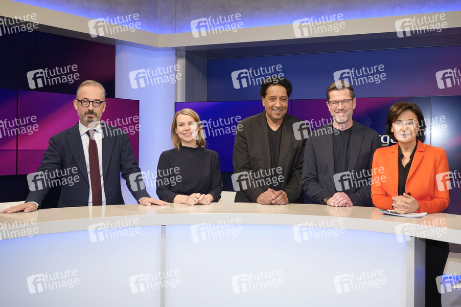 Jan Fleischhauer, Helene Bubrowski, Cherno Jobatey, Karl-Theodor zu Guttenberg undSandra Maischberger in der ARD-Talkshow 'maischberger' im Studio Berlin Adlershof. Berlin, 21.01.2025