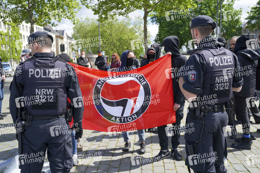 Demo, Demonstranten, Demonstration, Demonstrationszug, Erster Mai, Feiertag, Maidemo, Mai-Demo, Politik, Protestmarsch, Protestplakat, Protestzug, Tag der Arbeit, Polizei, Polizeieinsatz, Polizeibeamte, Polizeipräsenz, Polizist, Polizisten, Polizistin, Sicherheitskräfte, Corona, Sars-CoV-2, Covid-19, Coronavirus, Coronaviren, Corona-Virus, Coronakrise, Corona-Krise, Corona-Pandemie, Coronamaßnahmen, Corona-Schutz, flatten the curve, Ausnahmesituation, Kontaktverbot, Versammlungsverbot, Mindestabstand, Social Distancing, Kontakt verboten, Ausgangsbeschränkung, Abstand, Abstandhalten, Abstandsregel, Abstandsregeln, Allgemeinverfügung
