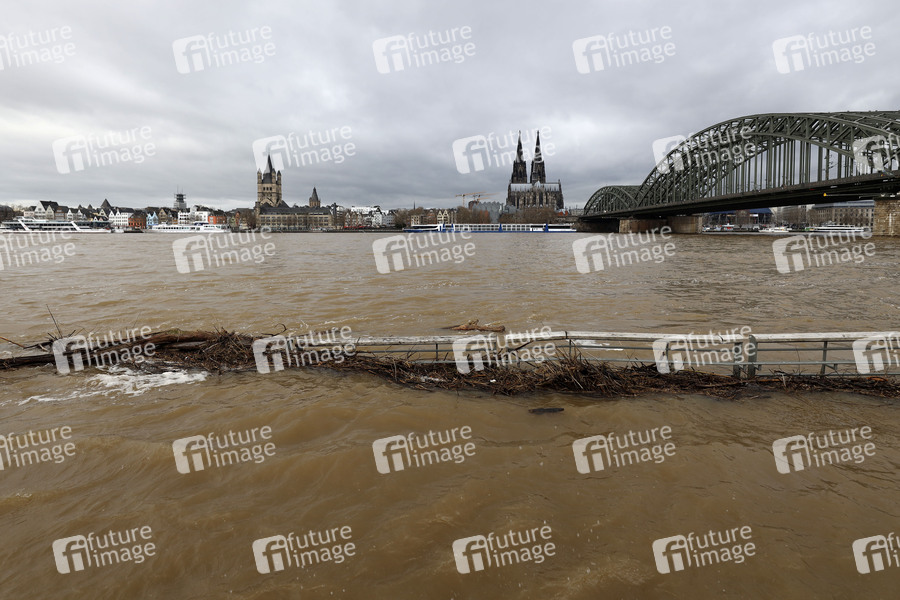 Wegen Hochwasser ist der Zugang zum Rheinboulevard versperrt. Nachdem der Rheinpegel gestern die erste Hochwassermarke überschritten hatte, gaben die Stadtentwässerungsbetriebe (StEB) heute Entwarnung: Der Wasserstand am Kölner Pegel betrug am Freitagmorgen nur noch 6,82 Meter. Köln; 07.01.2022