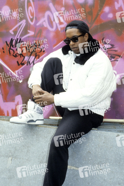 Derek B bei einem exklusiven Photoshooting vor einer Graffiti-Wand. London, 15.03.1990