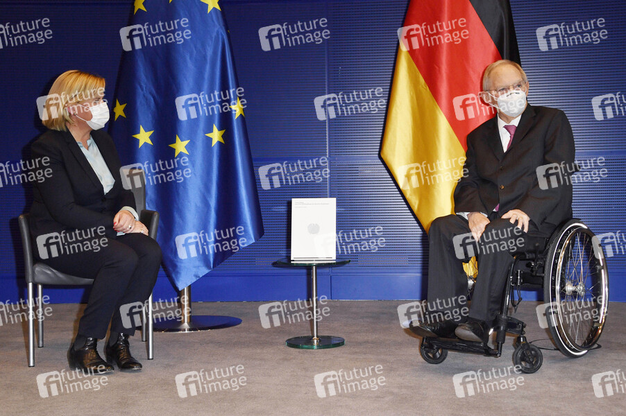 Eva Högl und Wolfgang Schäuble bei der Übergabe des Jahresberichts 2020 der Wehrbeauftragten an Bundestagspräsident Schäuble im Reichstagsgebäude. Berlin, 23.02.2021