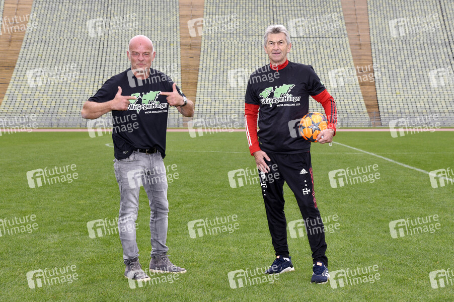 Stefan Lehmann und Klaus Augenthaler beim Fototermin zur sportichen '#WocheChallenge' im Olympiastation München. Unter dem Motto 'Wir können was bewegen!' ruft die Welthungerhilfe zu dieser Challenge auf und bittet um Spenden für eine Welt ohne Hunger. München, 13.10.2020