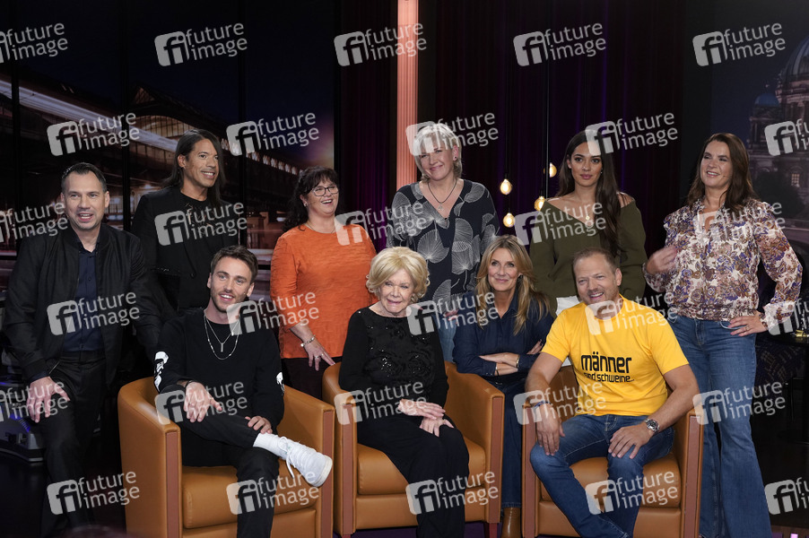 Sebastian Fitzek, Jorge Gonzalez, Clueso, Anett Schwär, Ingrid van Bergen, Ute Spiegel, Kim Fisher, Nilam Farooq, Mario Barth und Katarina Witt bei der Aufzeichnung der MDR/rbb-Talkshow 'Riverboat' im Studio A im rbb Fernsehzentrum. Berlin, 15.10.2021